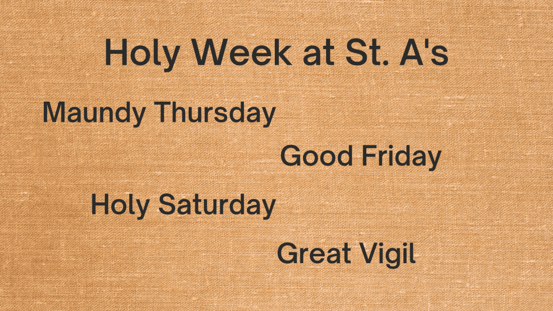 This year we will be able to have our Holy Week commemorations in person (with one being online for ease of access)! All services will begin at 7:00 PM at the Chapel. The plan is to have them outdoors, weather permitting. If we have to move indoors, masks will be required and we will spread … Continue reading Holy Week at St. A’s