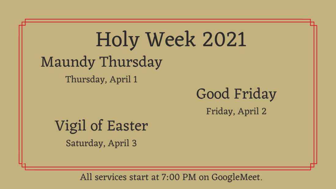 This year for what will hopefully be our last pandemic Holy Week, St. A's will be offering services for marking the death and resurrection of Jesus. Each service will begin at 7:00 PM and be online only (with one possible exception). We will gather for prayers, study of our texts, reflections and homilies, and most … Continue reading Holy Week 2021